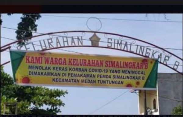 “Kami warga Kelurahan Simalingkar B menolak keras korban COVID-19 yang meninggal dimakamkan di pemakaman Pemda Simalingkar B Kecamatan Medan Tuntungan,” demikian isi spanduk tersebut.